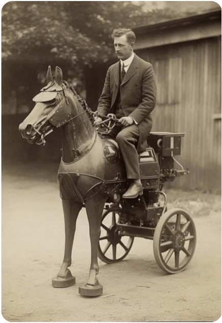George, wishing to proceed at speed, built the world’s first Equestropede. This fusion of a horse and cart, a tribute to the welder’s art, had a strong engine, 12 hp, which meant George travelled speedily. It ran on oats and gasoline, a strange concoction, unforeseen by Elon Musk and the X folk who would have seen it as a joke. George, Michelangelo reborn, treated the neigh-sayers with scorn.